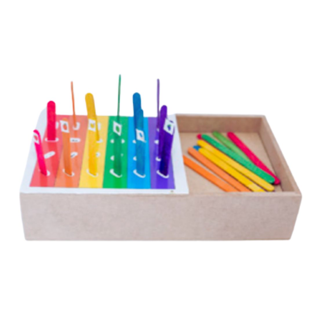 A Caixa de Palitos Coloridos trabalha coordenação motora fina, cores e matemática. O kit inclui uma caixa em MDF, 50 palitos e 4 cartelas.