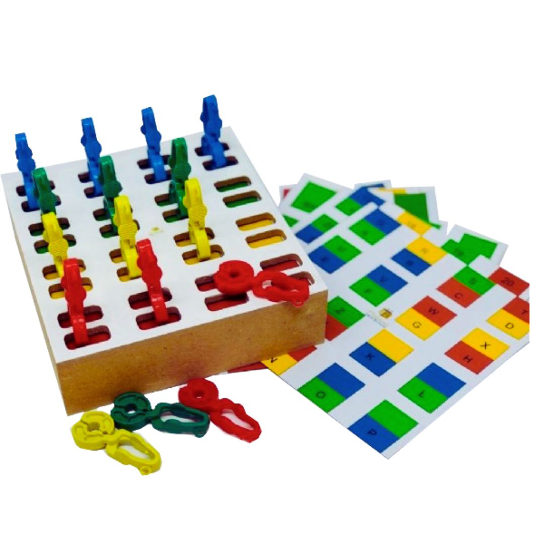 A brincadeira começa, portanto, quando a criança usa os pregadores para seguir os padrões das cartelas, criando sequências de cores, números, letras ou sílabas. Dessa forma, a atividade estimula a percepção espacial e o raciocínio lógico, enquanto as pinças ajudam a fortalecer a musculatura das mãos.
