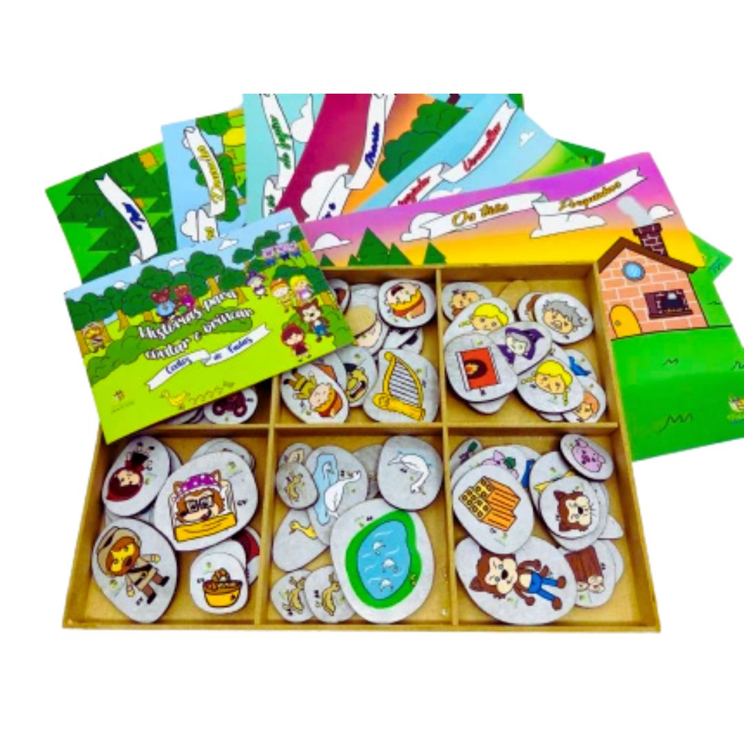 O kit contém fichas e cenários em MDF para cada conto, permitindo que os pequenos mergulhem em mundos mágicos e narrativas atemporais.