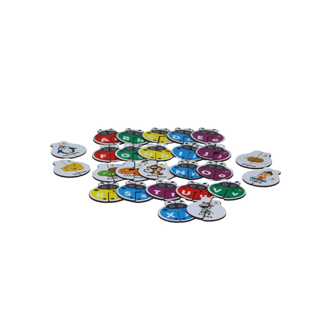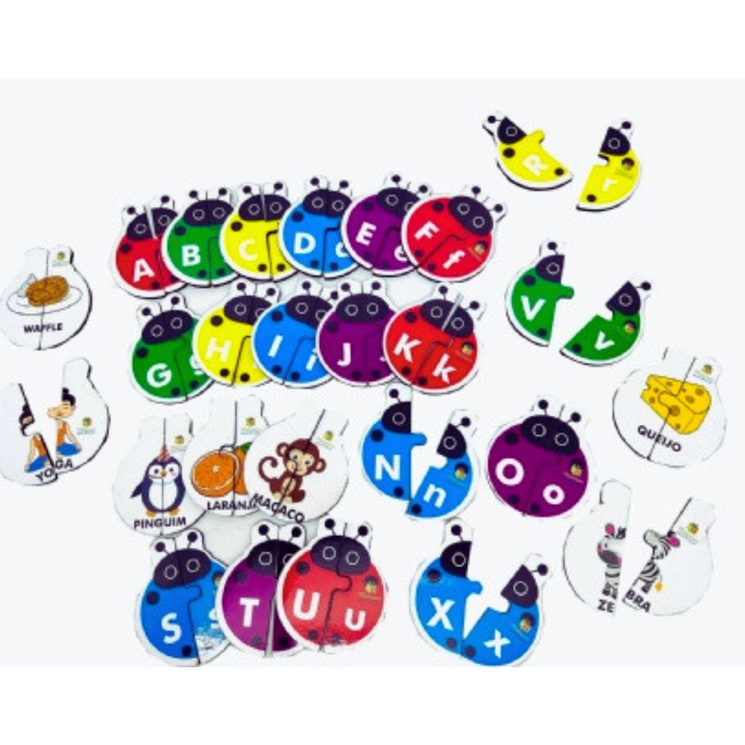 O jogo contém 26 quebra-cabeças em forma de joaninha, todos feitos em MDF. Afinal, cada joaninha traz na frente a letra do alfabeto em sua forma maiúscula e minúscula. No verso, a criança encontra um desenho correspondente, o que torna o aprendizado ainda mais significativo.