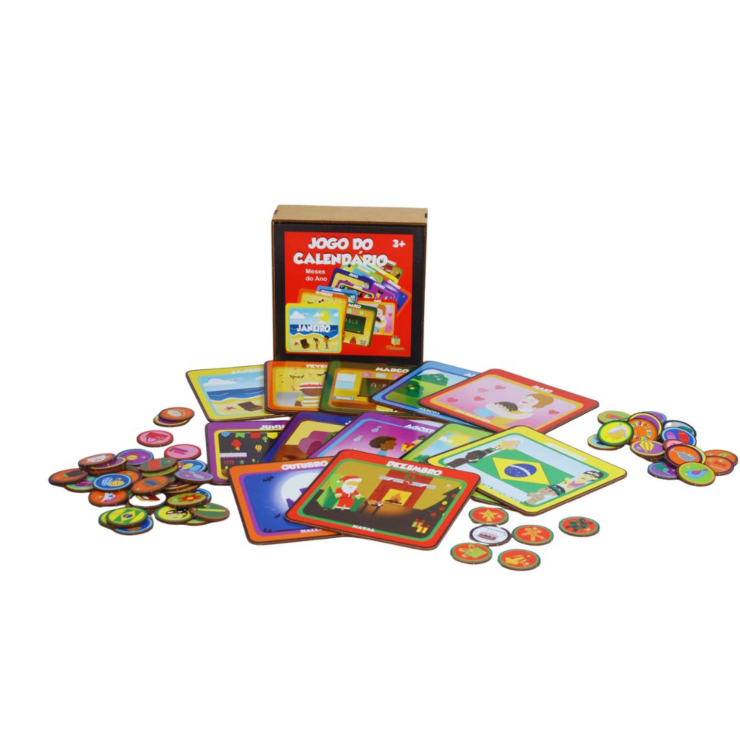 O Jogo do Calendário trabalha meses do ano e datas comemorativas. Contém 12 cenários e 61 fichas em madeira. Ideal a partir de 3 anos.