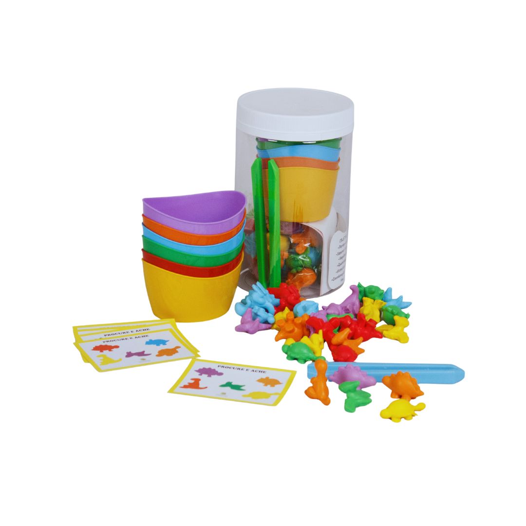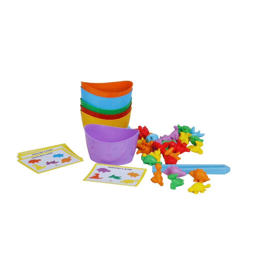 - Conteúdo Completo: Inclui 30 miniaturas de dinossauros em 6 cores e 5 formatos, uma pinça, 6 potinhos coloridos e fichas de atividades.