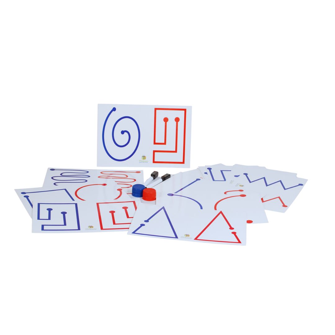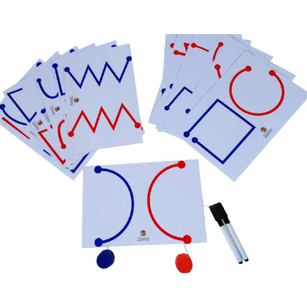 A brincadeira consiste em usar as duas mãos simultaneamente para traçar as linhas das fichas, seja com as canetas ou com as tampinhas. As 8 fichas com traços iguais e as 8 com traços diferentes oferecem desafios variados. Dessa forma, a criança aprimora a lateralidade, a organização espacial e a concentração.