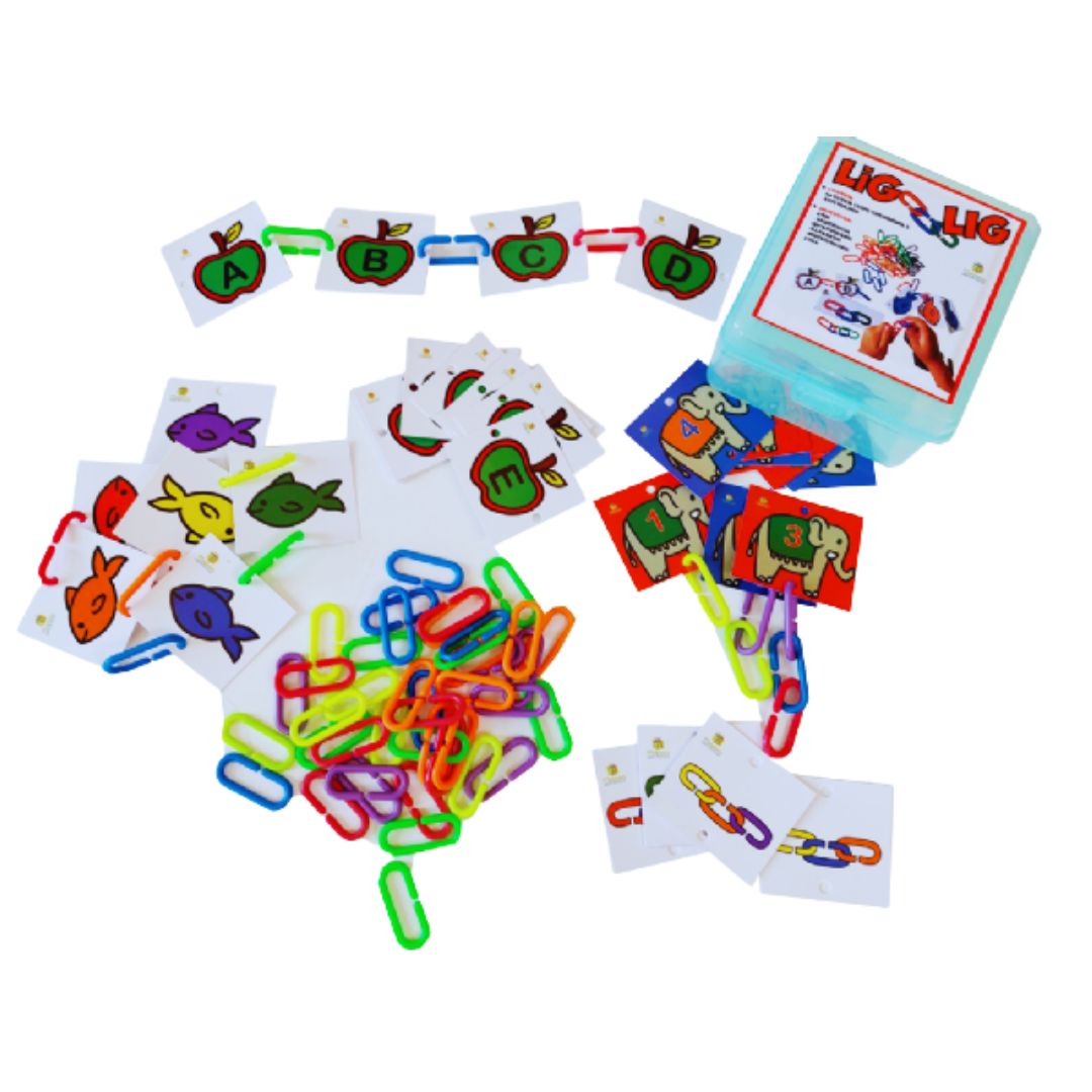 O jogo Lig Lig trabalha coordenação motora fina, sequências, cores e alfabeto com 60 super clips e cartas de atividades. Ideal a partir de 3 anos.
