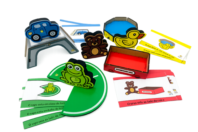 Contém: 4 figuras em EVA (pato, sapo, carro e urso), 4 objetos em MDF piscina, folha, ponte e caixa. E cartas modelo das posições espaciais.