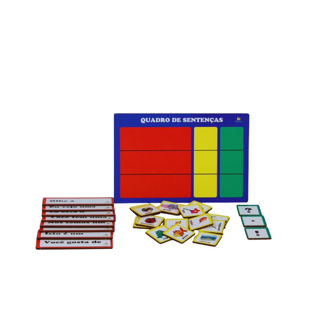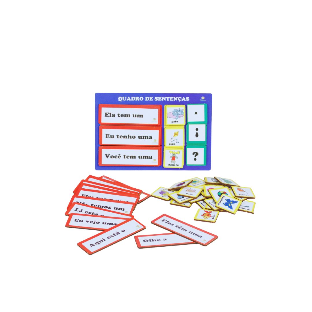 O Quadro de Sentenças é uma ferramenta educativa projetada para aprimorar as habilidades de linguagem, leitura e gramática em crianças a partir de 4 anos. Pois o conjunto, feito em MDF, contém um quadro, 14 frases, 27 figuras ilustrativas e 3 sinais de pontuação. Assim, a criança pode explorar a construção de frases de forma interativa e divertida.
