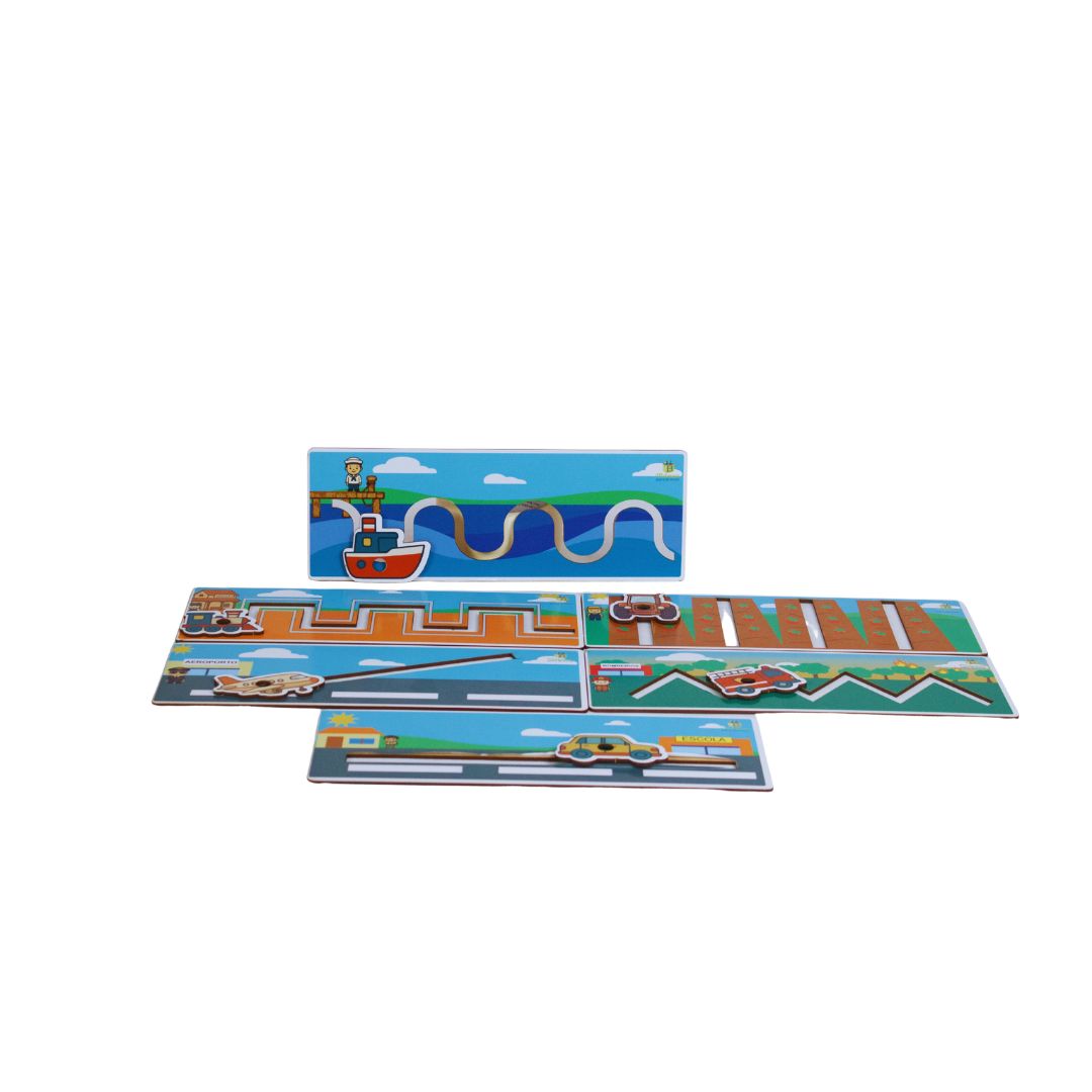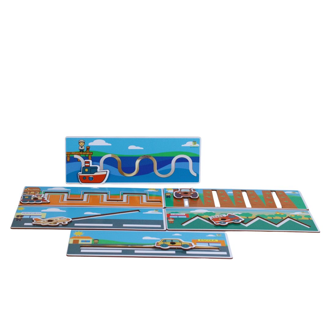 Ao encaixar o lápis no furo de cada meio de transporte, a criança é incentivada a traçar diferentes tipos de caminhos, como linhas horizontais, verticais, diagonais e curvas.